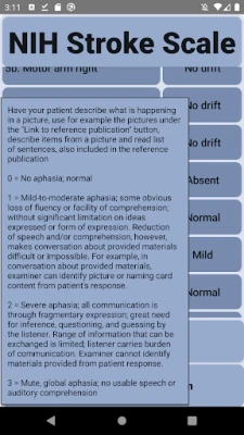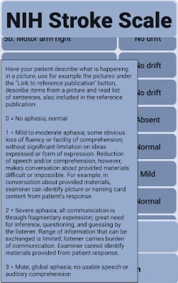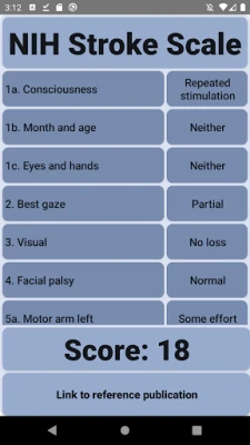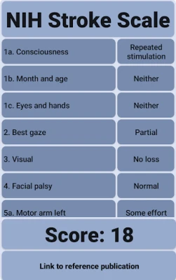 This is an implementation of the NIH stroke scale as defined in - https://www.stroke.nih.gov/documents/NIH_Stroke_Scale.pdf - The creator of this app is not associated with the NIH therefore a link to the original manuscript is included through a button in the user interface. The app was created to provide an easy to access reminder and calculator for bed side evaluation of a patient.
