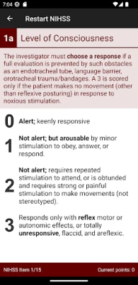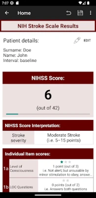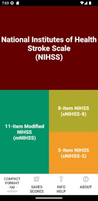 This application calculates NIHSS score , modified NIHSS score, short 8 item NIHSS score and short 5 item NIHSS scores. It is intended for use by healthcare professionals. Features: - no ads - full instructions for assessment - assess NIHSS, mNIHSS, sNIHSS-8 or sNIHSS-5 scores - regular (stepwise with full instructions) and compact ("pro") version - describe untestable items - all attachments - save results in searchable database - send, share or export results
