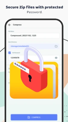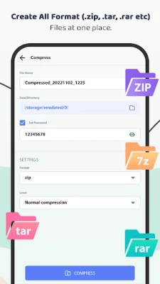 Compress all types of files and create a zip file, and extract compressed Zip files at any place of your phone storage.